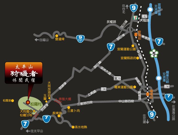 右轉泰雅大橋 → 左轉泰雅路 (台七省道) → 過大同加油站 → 經玉蘭至松羅部落 →太平山 狩獵者休閒民宿 |